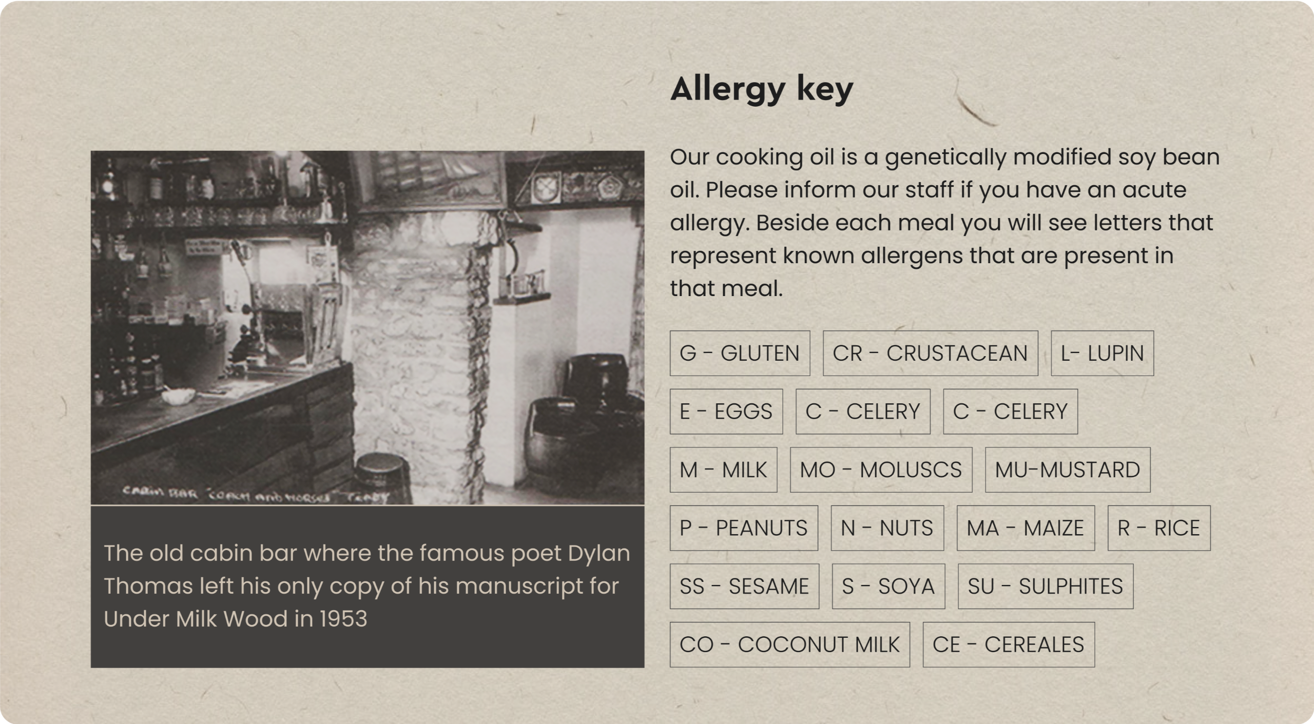 The pub was visited by Dylan Thomas, the famous poet in 1953 when Mr. Ceslie Stock was the landlord. The poet called at the pub after giving a reading to the local art club excerpt from his recently completed play for voices “Under Milk Wood”.
